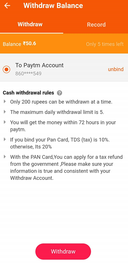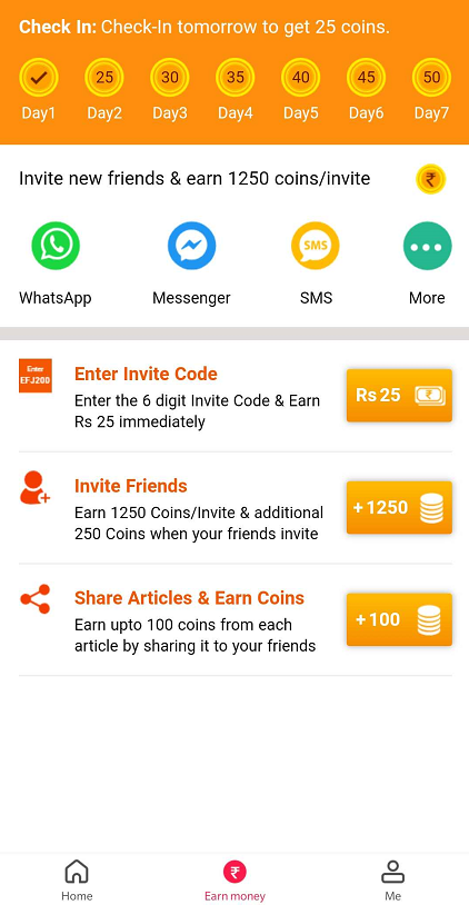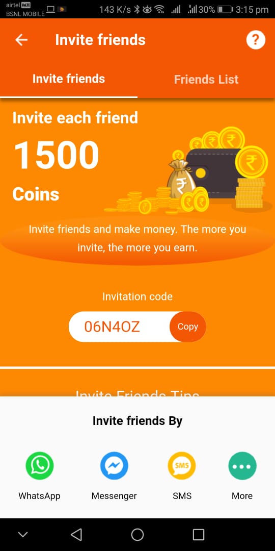 - Invite friends : share you invite code with friends ,when they firstly enter your invite code, you will get 5 Rs for each referral